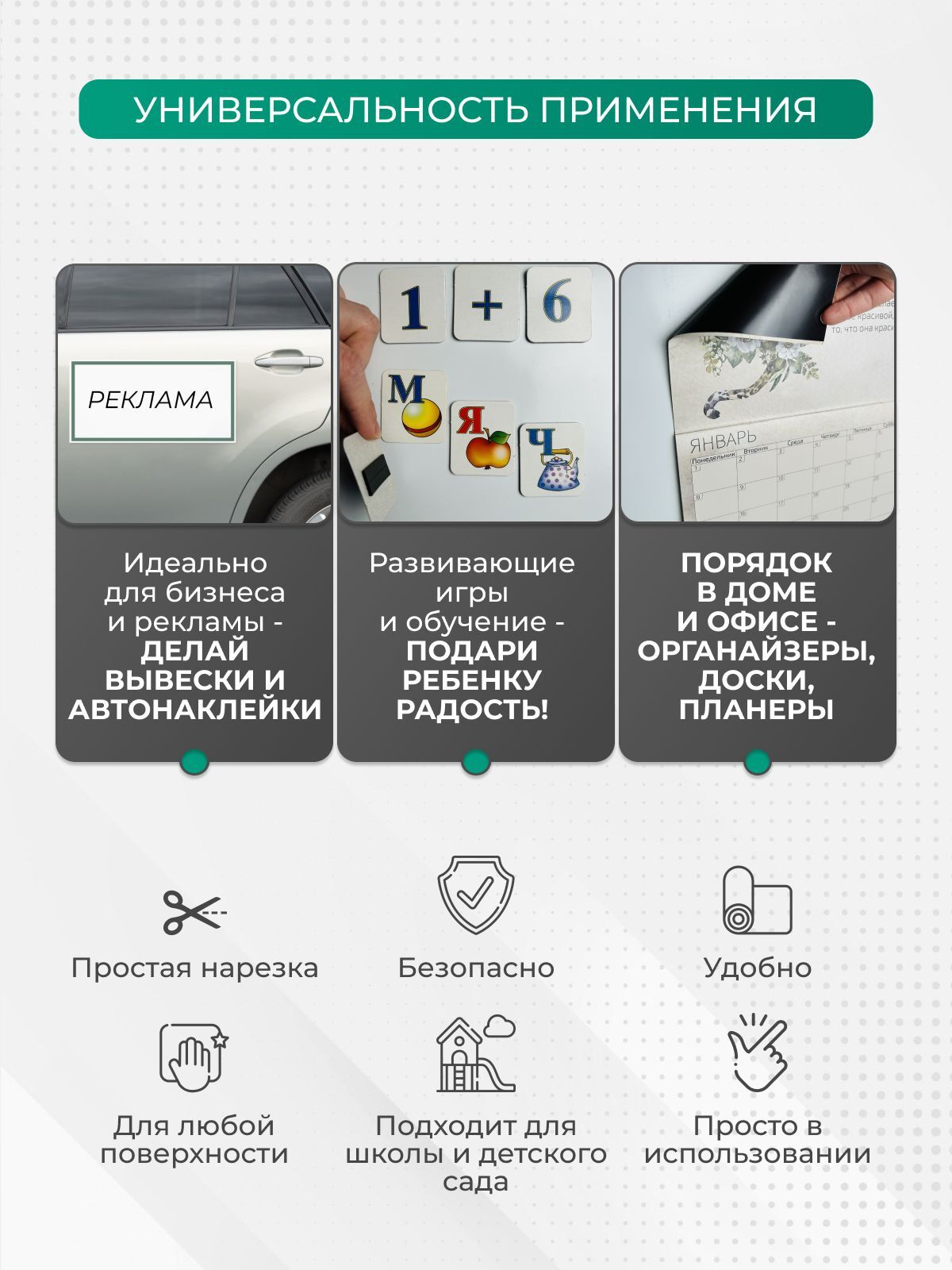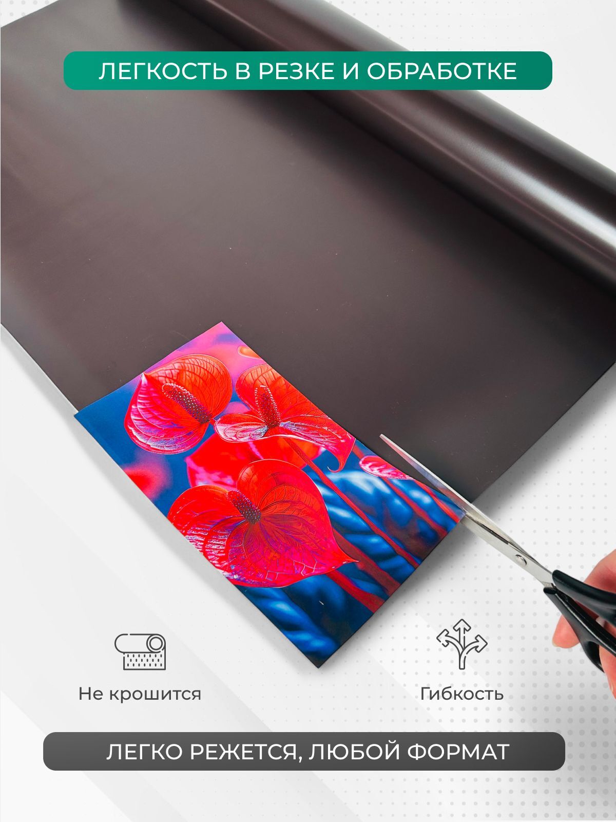 Гибкий магнитный винил в рулоне – это универсальный материал, идеально подходящий для творчества, изготовления магнитных изделий и декора. Его мягкость и пластичность позволяют легко резать листы любой формы и использовать их для создания оригинальных поделок, наклеек или магнитиков. Винил обладает прочной магнитной основой, что делает его надежным вариантом для крепления фото, календарей или записей на металлических поверхностях.Отсутствие клеевого слоя предоставляет свободу выбора при работе с материалом: вы можете самостоятельно добавить клеевую основу или использовать винил как есть. Этот вариант особенно удобен для создания съемных изделий, таких как магнитные полоски, держатели для инструмента или декоративные элементы на холодильник.Толщина материала оптимальна для сохранения гибкости и прочности. Такой винил отлично подойдет для работы с ножницами или специальными режущими инструментами, а также станет основой для магнитных наклеек и листов формата А4. Благодаря своим свойствам он широко используется в оформлении интерьера, создании магнитных обоев или досок.Магнитный винил может стать базовым элементом в создании необычных подарков – например, фото на магните или оригинальных календариков. Также его можно применять в рекламных целях: из него удобно изготавливать автомобильные наклейки или гибкие магниты на авто.Этот прочный и надежный материал отличается долговечностью и устойчивостью к внешним воздействиям. Он подходит не только для декоративного применения, но и для технических целей – например, как держатель для инструментов.Если вы хотите купить материал высокого качества для творчества и практических задач – этот магнитный винил станет отличным решением!