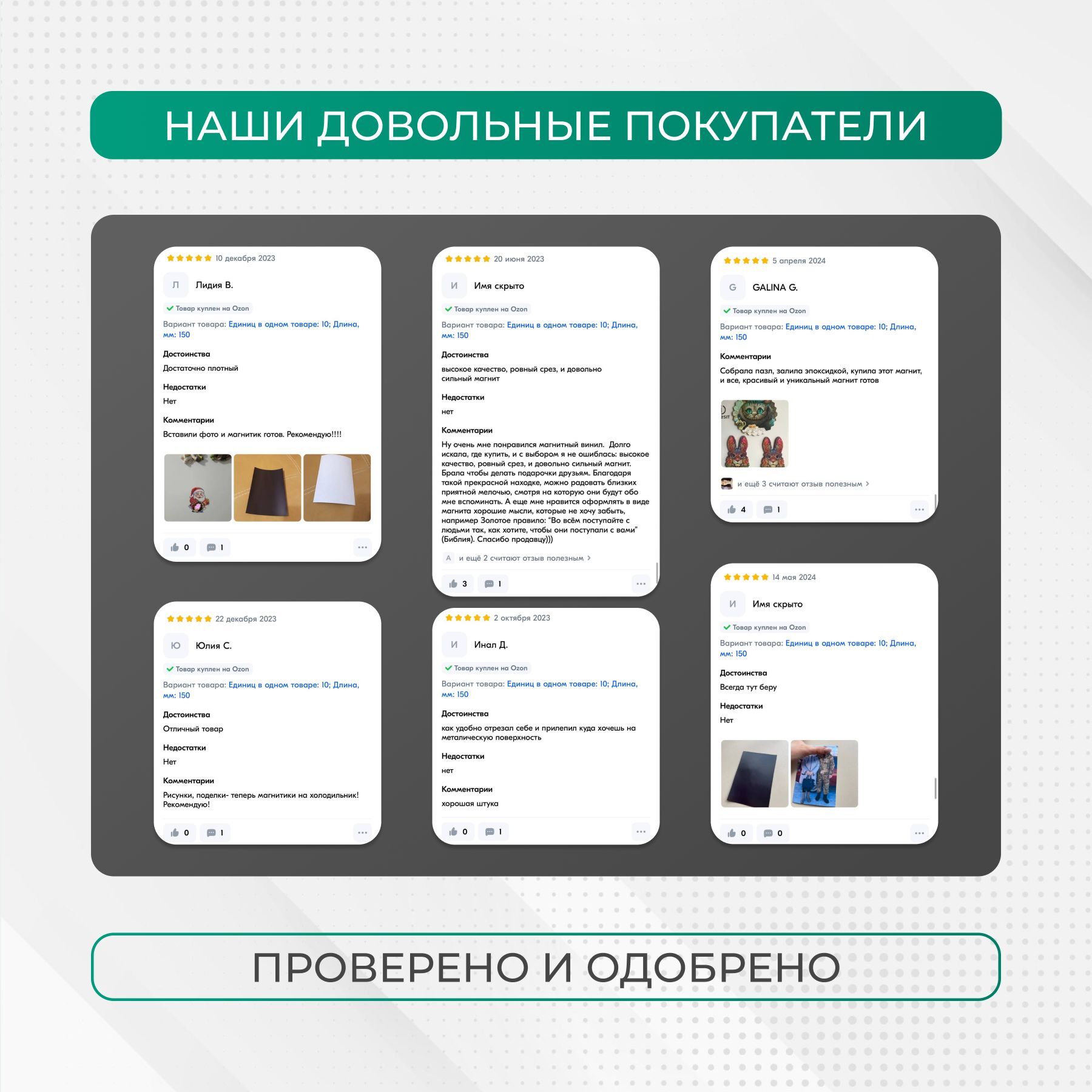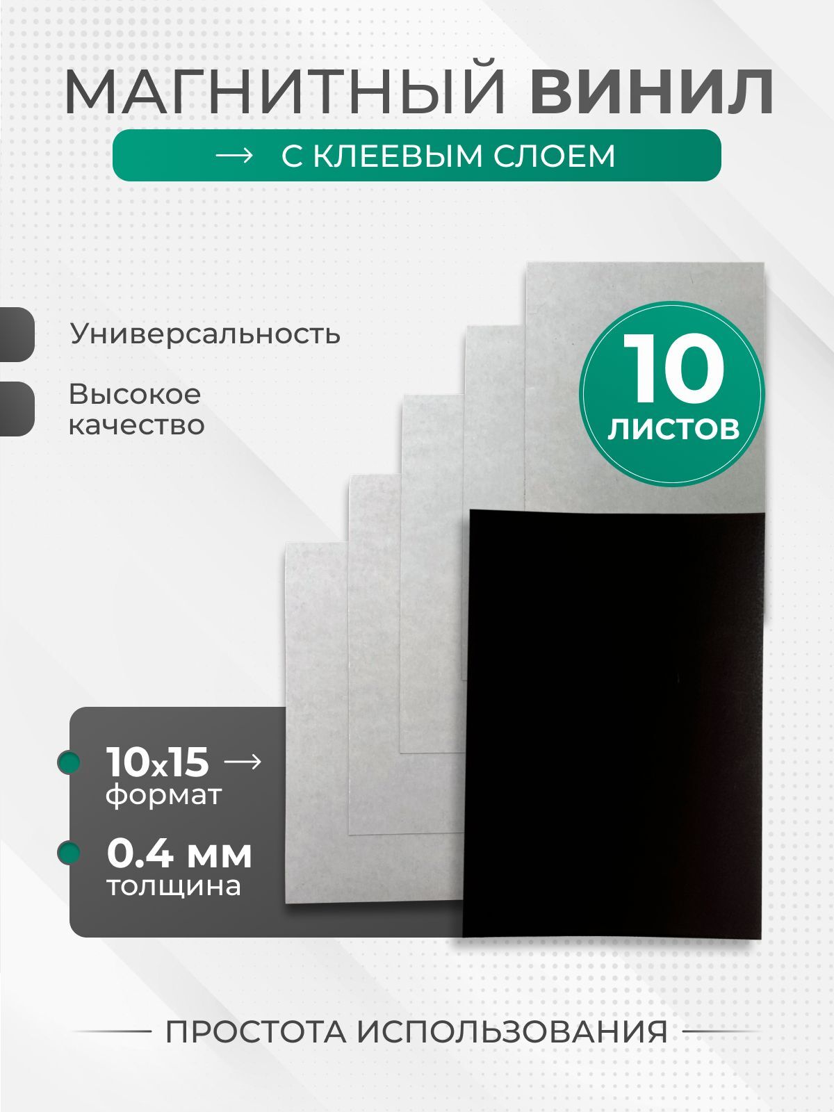 Магнитные виниловые листы с клеевым слоем имеют размер 10*15 (10 штук), толщина винила 0,4 мм.