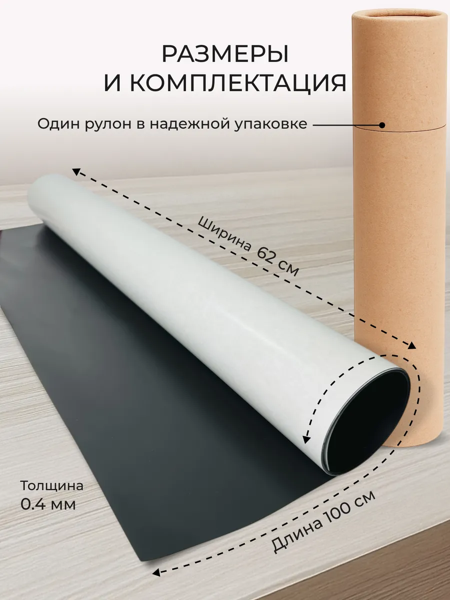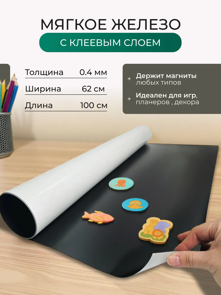 Гибкий лист мягкого магнитного железа с клеевым слоем это универсальный и удобный инструмент для дома, ремонта или творчества. Лист выполнен из прочного и гибкого полимерного материала черного цвета с гладкой поверхностью. Сам лист НЕ магнитный, но он идеально подходит для создания поверхностей, на которых можно крепить магнитные аксессуары и элементы декора.